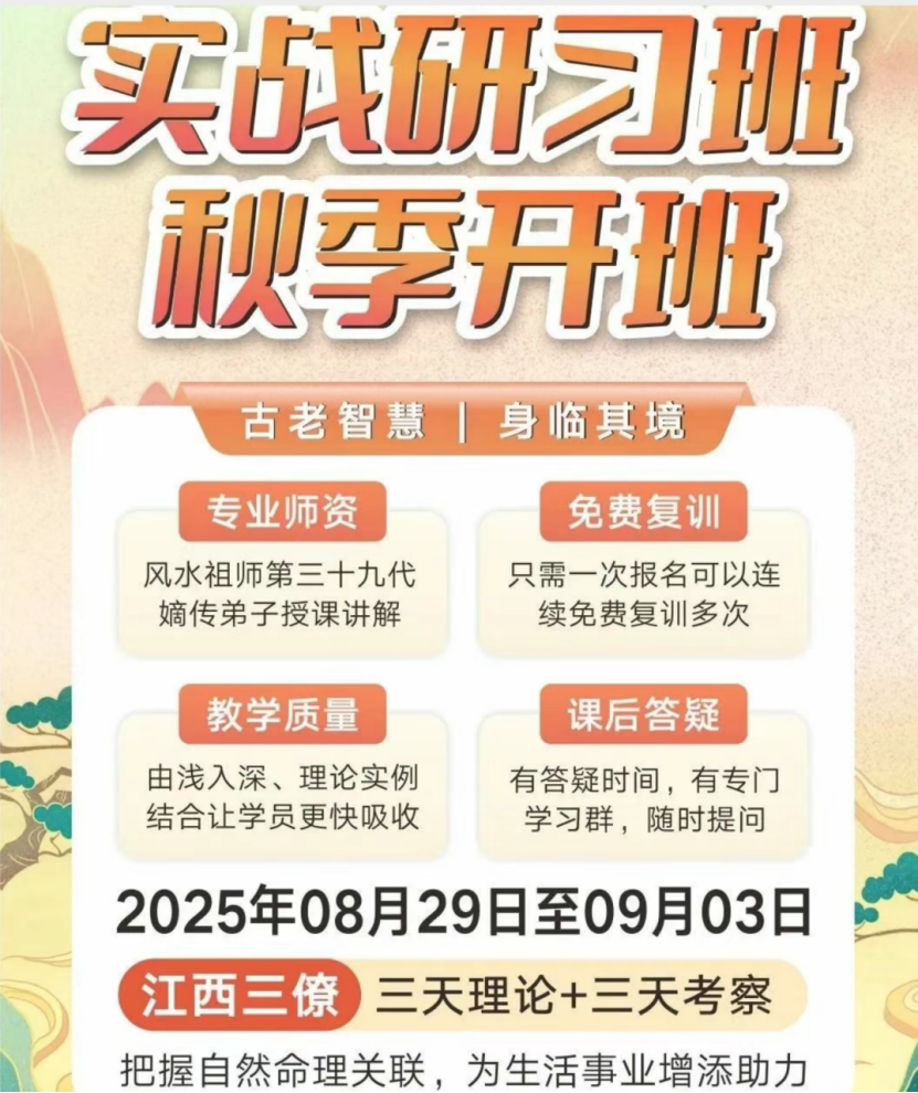 传承千年风水智慧,从三僚实战研习班开始。名额有限,先到先得,别让机遇擦肩而过!1866报名48热38线033: