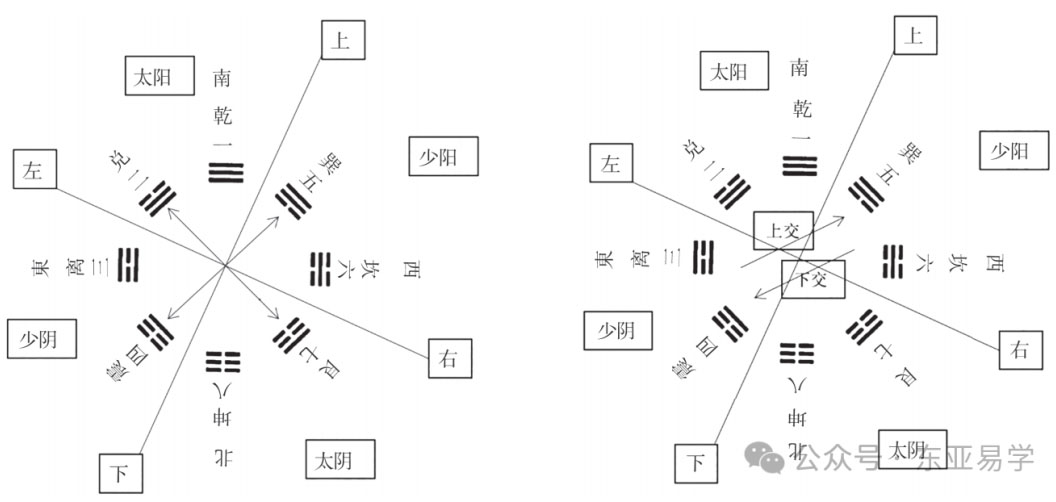《语类》 卷六十五中《先天图》 一节对于“交易”“博易”之法也多有记录,此处不备录。唯有暖渊所录一条,“老阴老阳交而生艮兑,少阴少阳交而生震巽。离坎不交,各得本画。离坎之交是第二画,在生四象时交了。老阳过去交阴,老阴过来交阳,便是兑艮第三画。少阴少阳交,便生震巽上第三画”,需要稍作解释。“老阴老阳交而生艮兑”,就是四象生八卦,太阴上半和太阳下半相交,太阴上半得艮,太阳下半得兑。“少阴少阳交而生震巽”,就是少阳上半和少阴下半相交,少阳上半得巽,少阴下半得震。所谓“离坎不交”,就是少阴上半仍为阳得离,少阳下半仍为阴得坎,仍为左右之本画,并未交易而变。因为在生第二画时,左下已和右上相交了。这一段是对于邵雍阴阳上下相交一段话的解释,也是对所谓“交易法”的简洁说明。